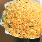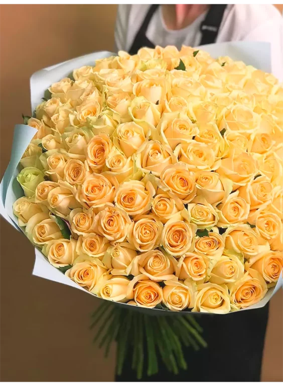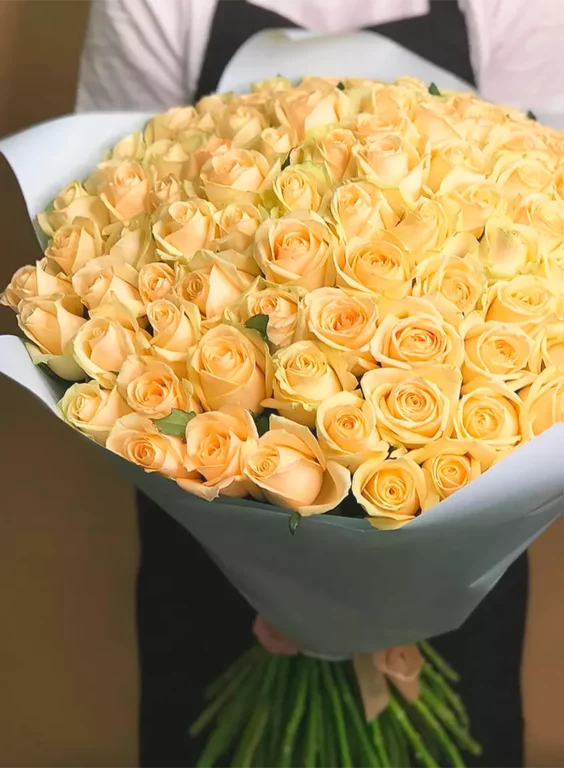 101 кремовая роза символизирует верность и достоинство. Роскошная цветочная композиция подходит, когда нужно проявить уважение, искреннее отношение, положительные эмоции. С помощью нежного, стильного букета отлично поздравлять дорогих людей с днем рождения, бракосочетанием или другим событием. Также с помощью потрясающего букета можно признаться в чувствах или пригласить девушку на свидании.