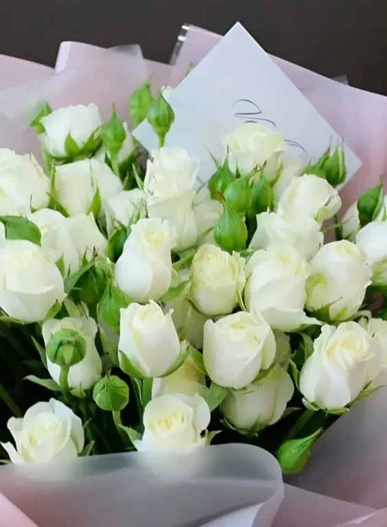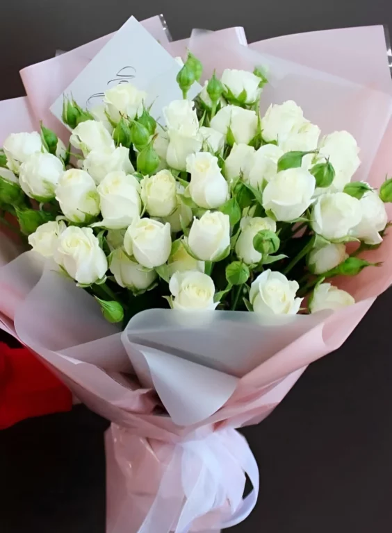Белые кустовые розы считаются прекрасным вариантом изысканного и нежного презента. Оттенок