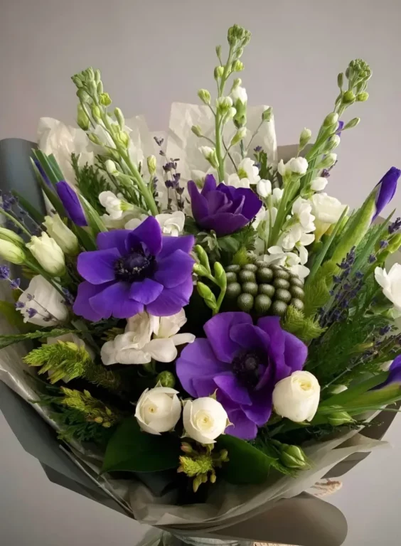 Доставка цветов / Анемоны, Ирисы, Лизиантусы, Маттиола, Розы / Букет «Blagouhayushchaya krasavica»