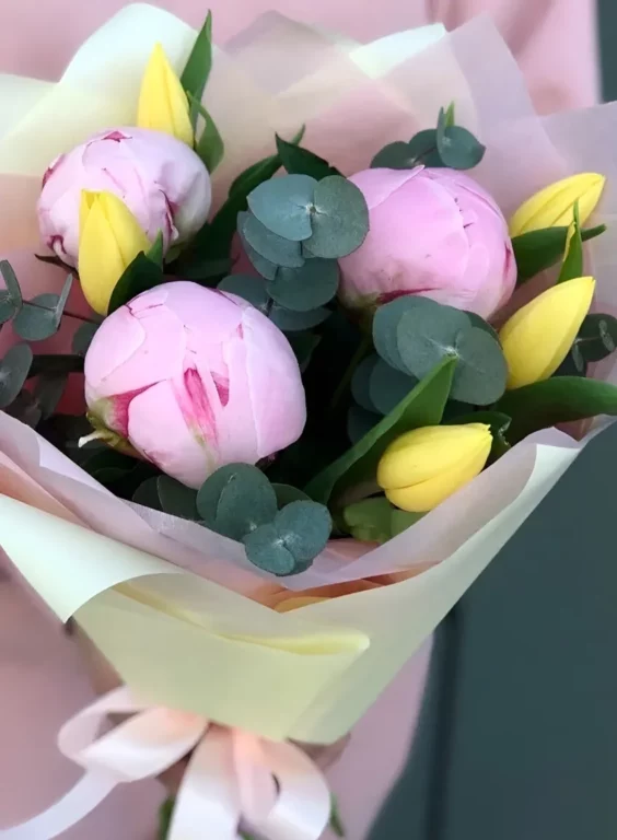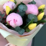 Доставка цветов / Пионы, Тюльпаны, Эвкалипт / Букет «Divnaya skazka»