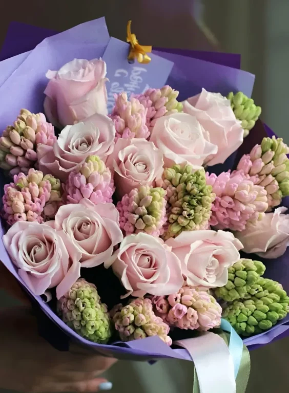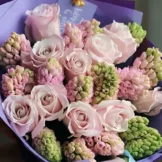 Доставка цветов / Гиацинты, Розы, Эвкалипт / Букет «Хеппи энд»