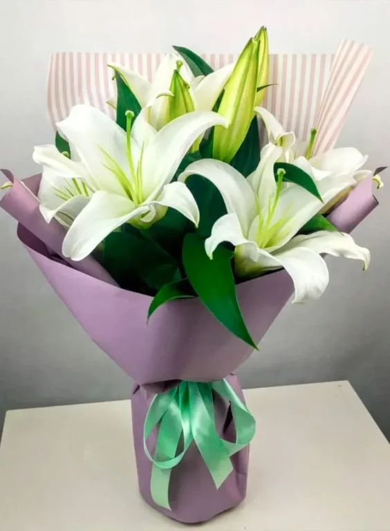 Букет из 5 лилий станет приятным и запоминающимся сюрпризом. Считается, что цветы олицетворяют роскошь, изысканность и доброту. Значение наделяет цветочную композицию разными смыслами, что позволяет преподносить букет в качестве поздравления с днем рождения, свадьбой или другим важным, торжественным мероприятием. Часто бутона дарят как символ уважения, благодарности.