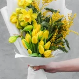 Букет из мимозы и тюльпанов считается настоящим олицетворением весны. С помощью яркой цветочной композиции вы сможете приятно удивить дорогого человека, вызвать у него массу положительных эмоций. Невероятное сочетание растений станет прекрасным презентом на 8 Марта, день рождения весной. Стильный букет останется в памяти как приятный сюрприз.