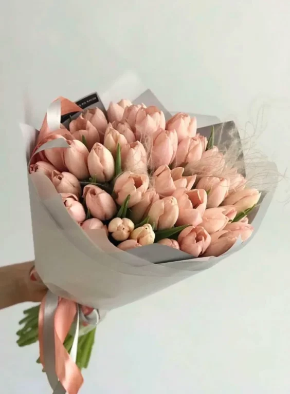 Букет из персиковых тюльпанов – роскошные и в то же время исключительно нежные цветы.