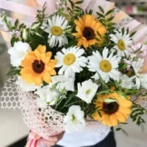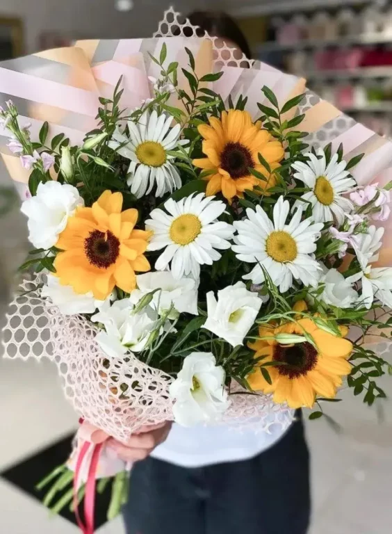 Доставка цветов / Лизиантусы, Подсолнухи, Ромашки / Букет из подсолнухов и ромашек