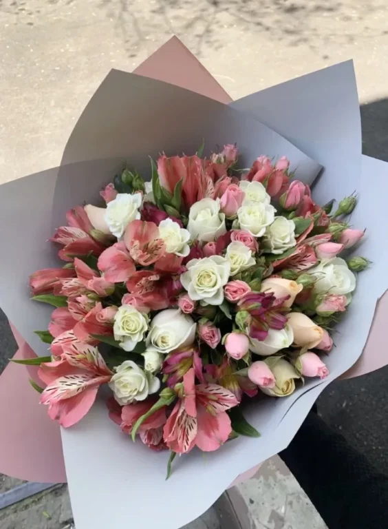Букет из роз и альстромерий считается прекрасным сочетанием нежности и изысканности.