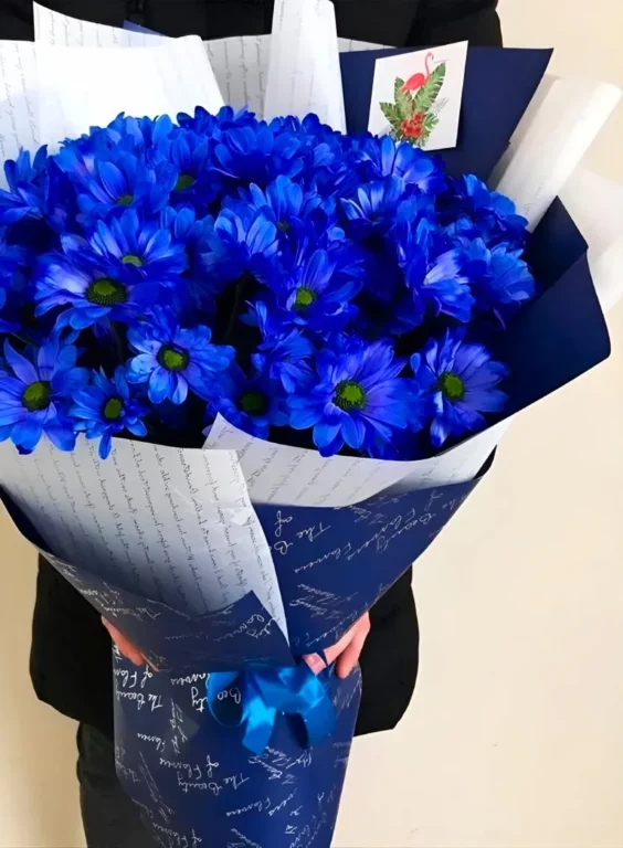 Синие хризантемы – это символ мудрости, спокойствия и верности. Его принято дарить людям, вне зависимости от пола. В монобукете они выглядят необычно и стильно. Прекрасная цветочная композиция для ярких, неординарных личностей, которые по достоинству оценят ваш оригинальный подход к поздравлению. С помощью букета можно поздравить человека с завершением важного проекта.
