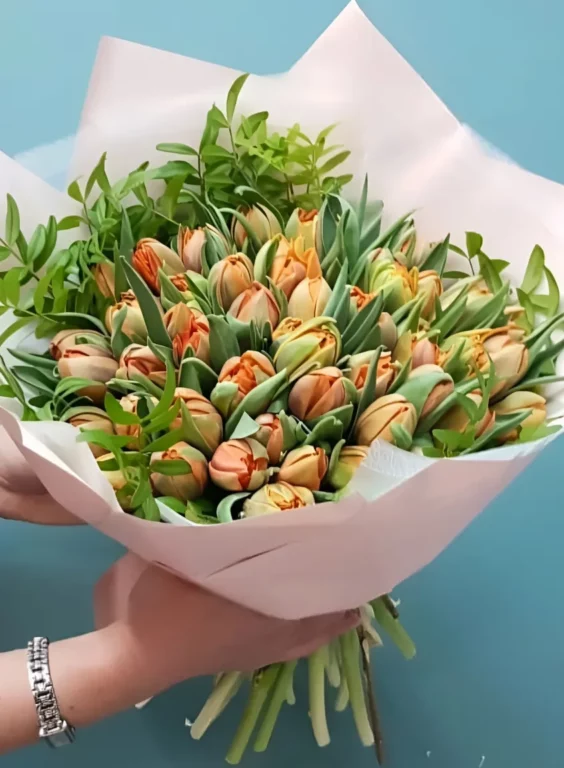 Букет из тюльпанов с зеленью смотрится свежо и стильно. Изысканные бутоны в окружении