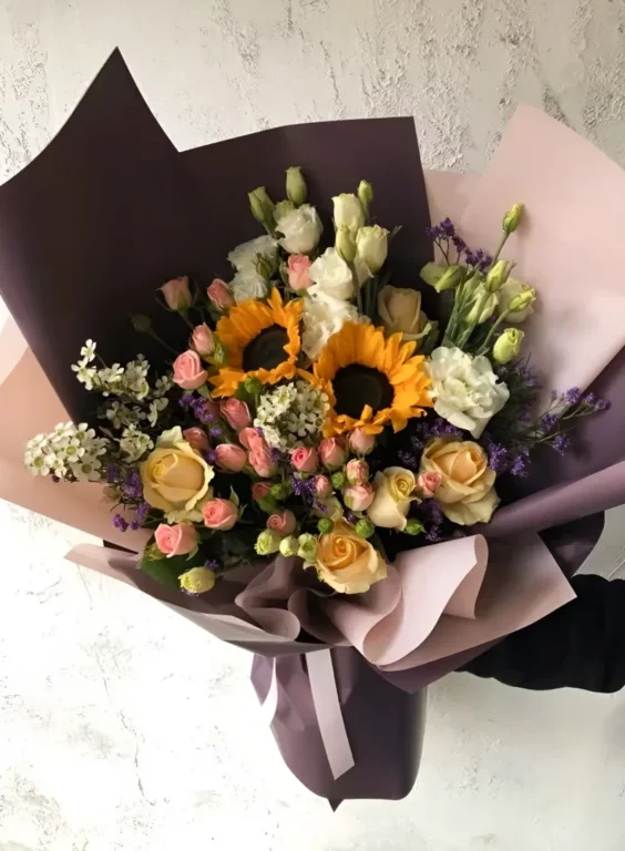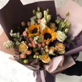 Доставка цветов / Лизиантусы, Подсолнухи, Розы / Букет «Kantata»