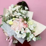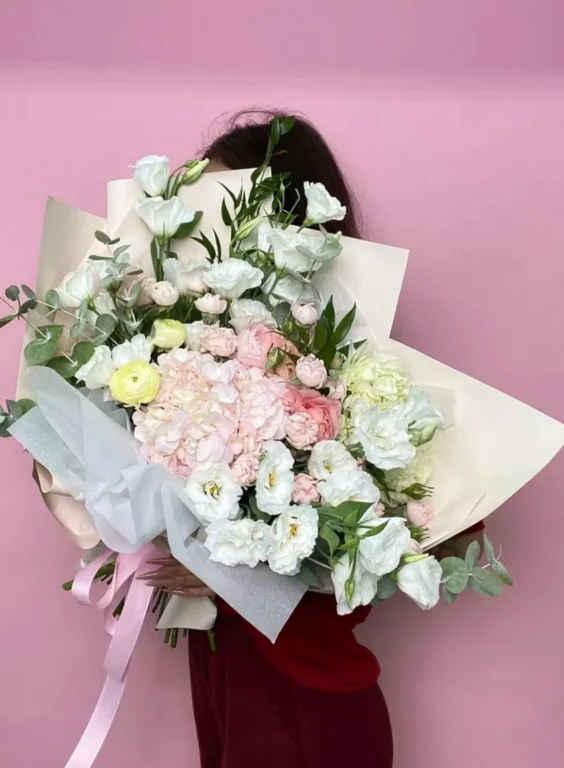 Доставка цветов / Гортензии, Лизиантусы, Ранункулюсы, Розы / Букет «Криспи Крим»