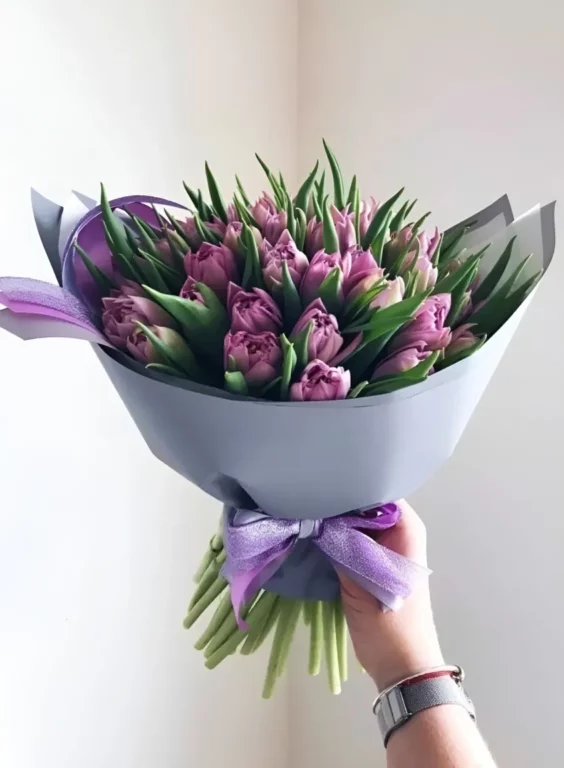 Букет сиреневых тюльпанов – прекрасный подарок для любимой половинки, мамы, сестры,