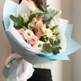 Букет «Венский вальс» напоминает роскошную музыкальную композицию о любви. Шикарные розы отлично сочетаются с альстромериями, эвкалиптом. Благодаря подбору оттенков создается атмосфера теплых чувств, заботы и искренности. Флористы используют лаконичное оформление, которое добавляет букету изысканности.