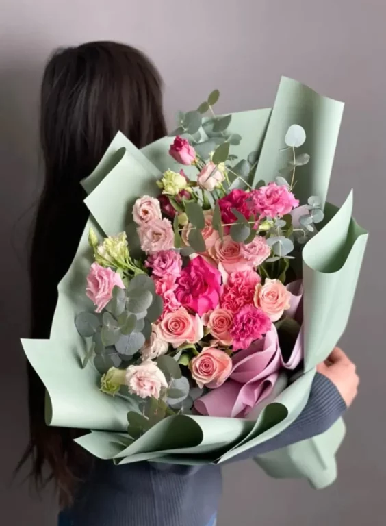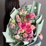 Доставка цветов / Гвоздики, Лизиантусы, Розы, Эвкалипт / Букет «Vesennyaya rapsodiya»
