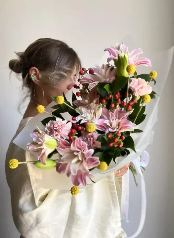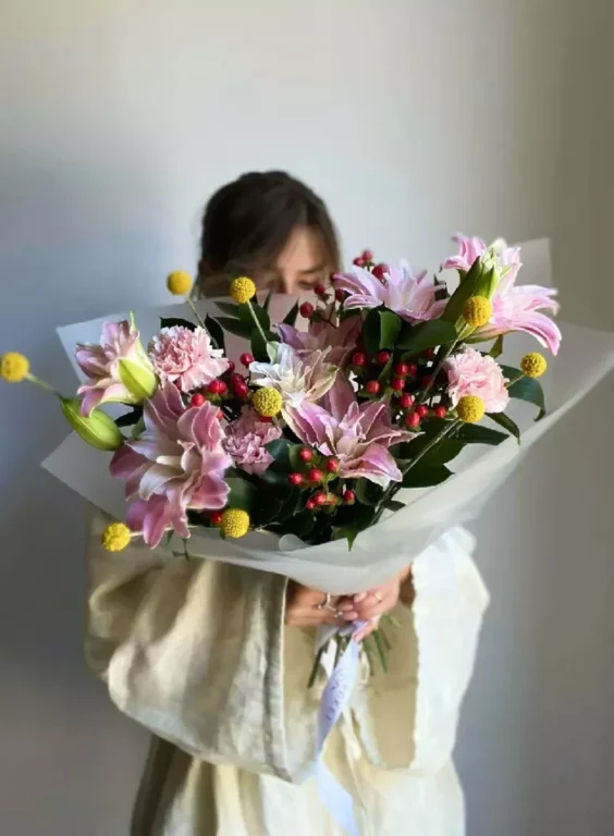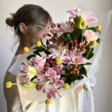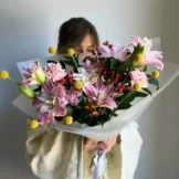 Доставка цветов / Гвоздики, Гиперикум, Лилии / Букет «Yarkaya zhizn»