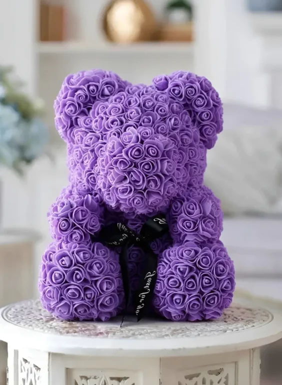 Фиолетовый мишка из роз станет необычным сюрпризом для близкого человека. Отличается оригинальным внешним видом, ведь используются специальные розочки, создающие 3D-эффект. Прекрасный способ порадовать как взрослых, так и детей. Фигурка будет долгое время сохранять первоначальный вид.