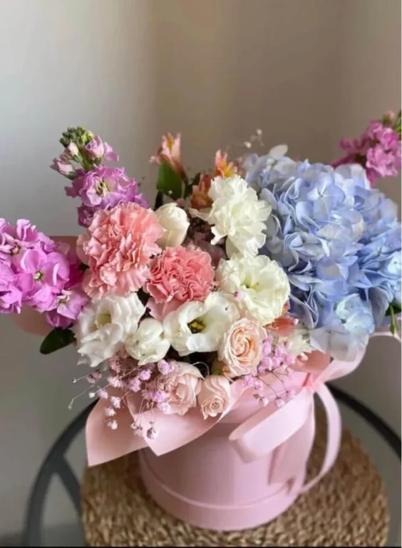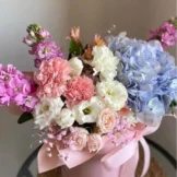 Доставка цветов / Гвоздики, Гипсофилы, Гортензии, Лизиантусы, Маттиола, Розы / Композиция «Krasochnyj briz»