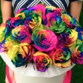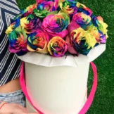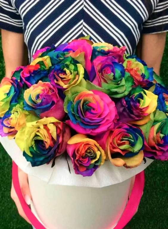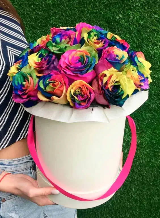 Радужные розы в коробке составляют настоящий калейдоскоп. Удивительная цветочная