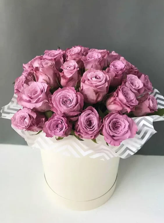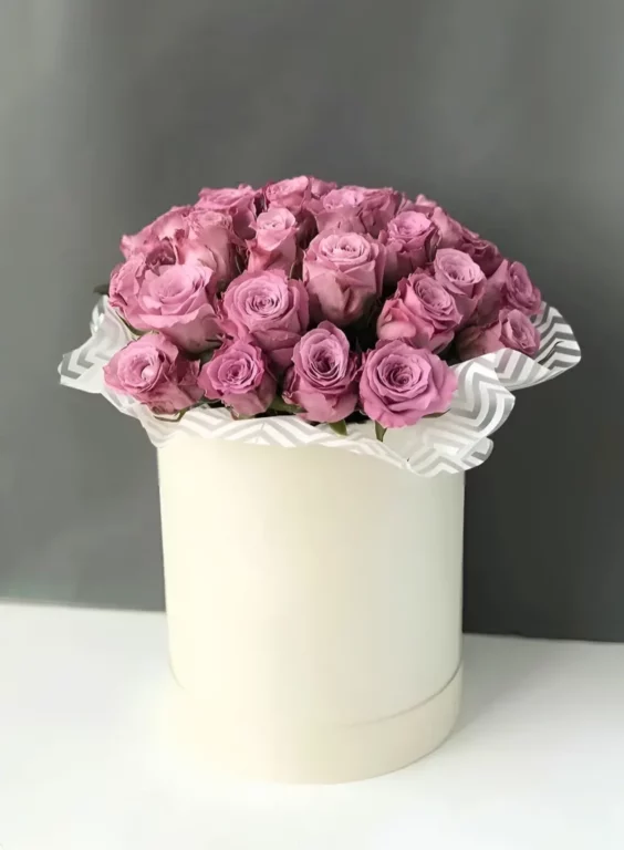 Сиреневые розы в шляпной коробке выглядят как ода безупречному вкусу, эта композиция радует