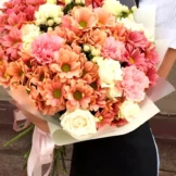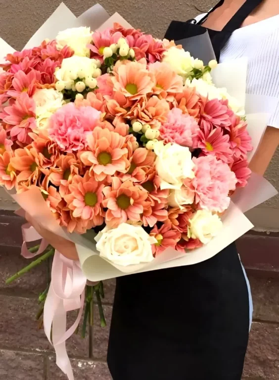 Букет из хризантем и гвоздик способен продолжительное время напоминать человеку о вашем прекрасном отношении. Это обусловлено природными свойствами удивительных цветов, они долго сохраняют первоначальную свежесть и наполняют помещение неповторимым ароматом. Цветочная композиция прекрасно подходит для поздравления с важными датами или незапланированного сюрприза.