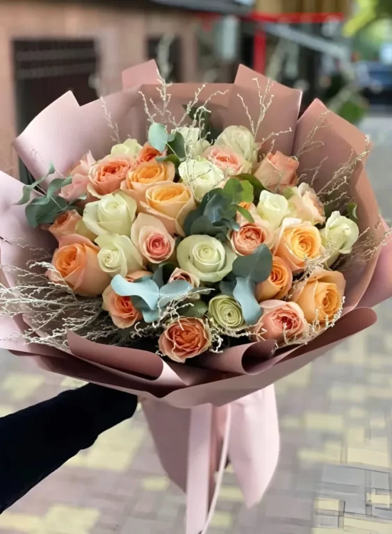 Букет роз с зеленью – отличный способ поднять настроение любимой или поздравить с днем