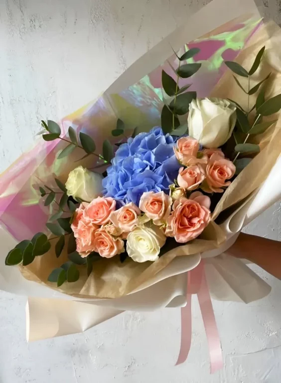 Доставка цветов / Гортензии, Розы, Эвкалипт / Букет «Persikovyj raj»