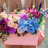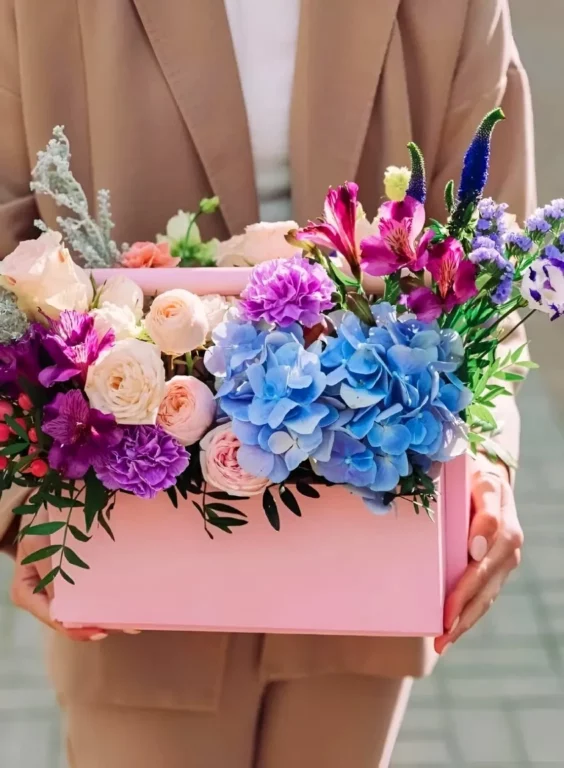 Доставка цветов / Гвоздики, Гортензии, Лизиантусы, Розы / Композиция «Teplye mgnoveniya»