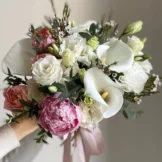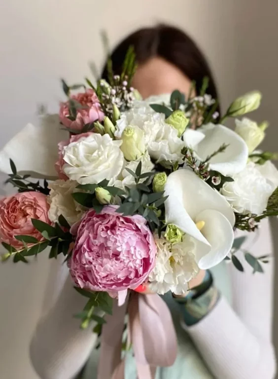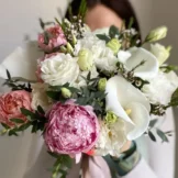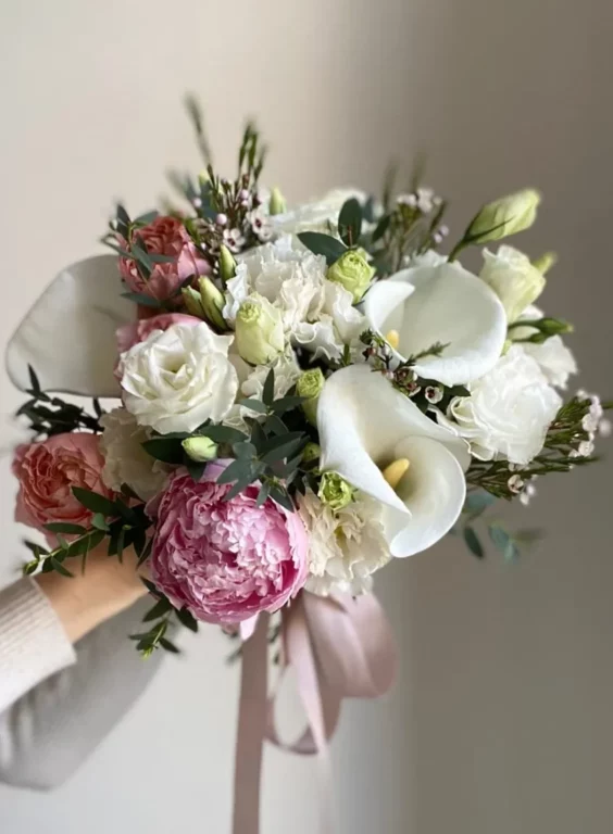 Доставка цветов / Каллы, Лизиантусы, Пионы, Розы / Свадебный букет «Брайд»